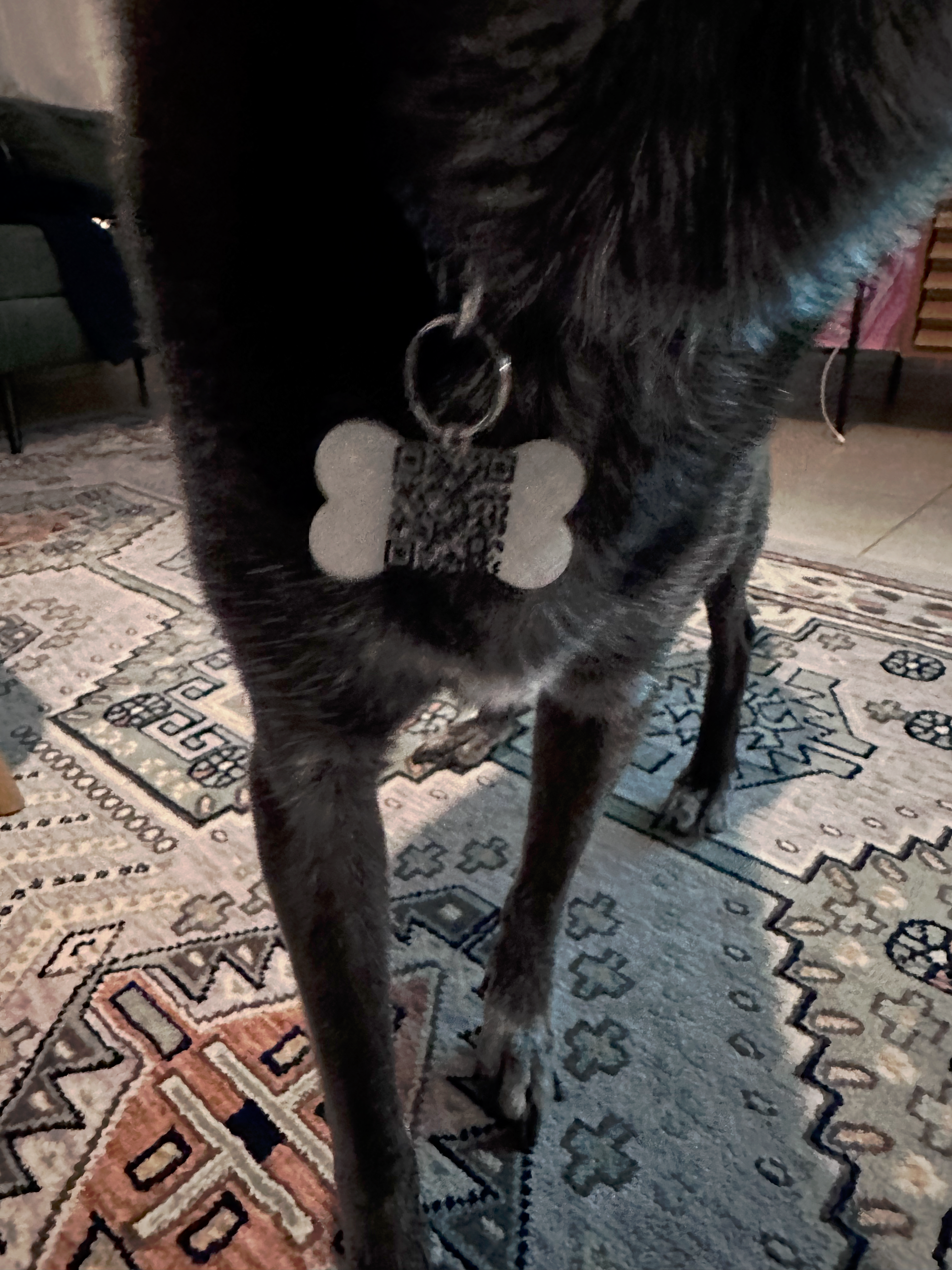 A dog tag that attaches to your dog’s collar and features a QR code that opens WhatsApp only.